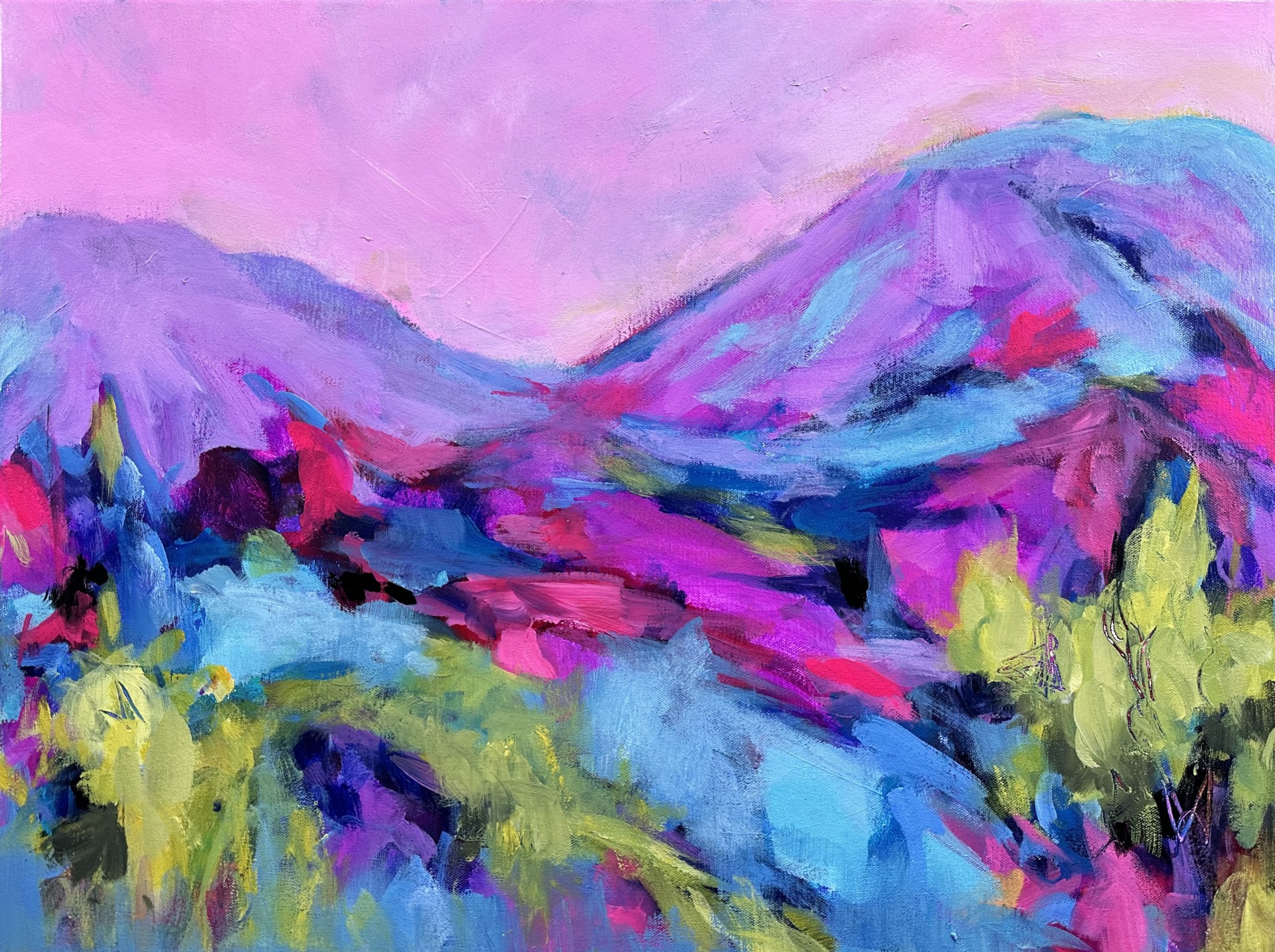 With a love of joyful, vibrant colour palettes and loosely inspired by my love of colourful flower gardens and the New Zealand landscape, I like to create bold expressionist works. The thing I most love about painting compared to other art forms I have worked with in the past, is that the colour possibilities with paint are endless and unlimited.